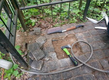 Разбираем разбитую в месте дозахоронения брусчатку, чистим стыки от лишнего бетона.