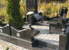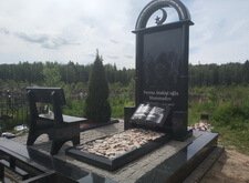 Собираем лавочку, устанавливаем её напротив надгробья. Цветник у подножья мемориальной стелы наполняем светлыми камнями. Под полукруглую арку памятника укрепляем вырезанную из гранита фигуру полумесяца.